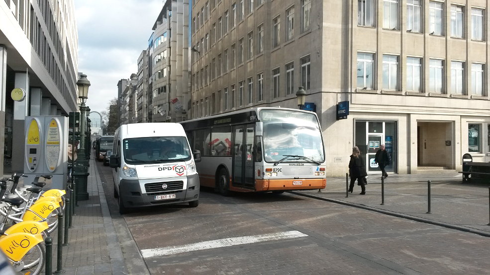 Bus forcé de dépasser une camionnette arrêtée en double file. Rue du Luxembourg (BXL) Photo: YF, 2015