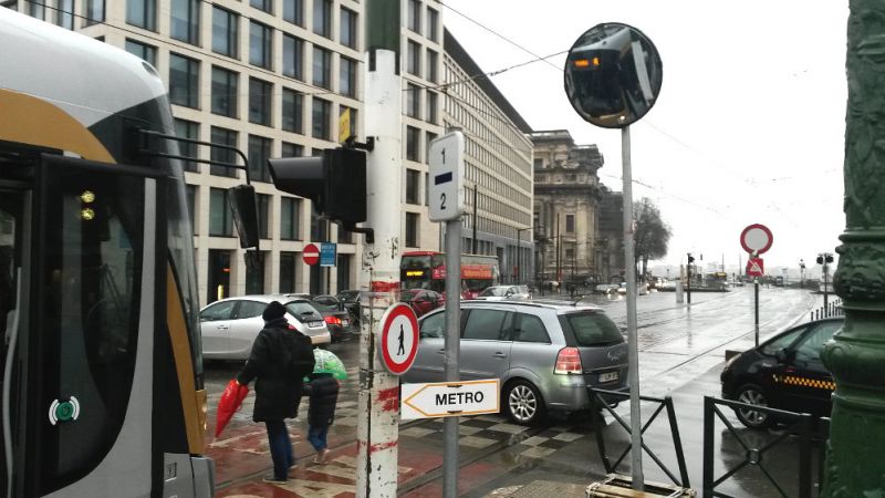 Tram empêché de redémarrer car un piéton traverse, mais aussi parce que les voitures occupent les voies. Place Louise (BXL) Photo: YF, 2016