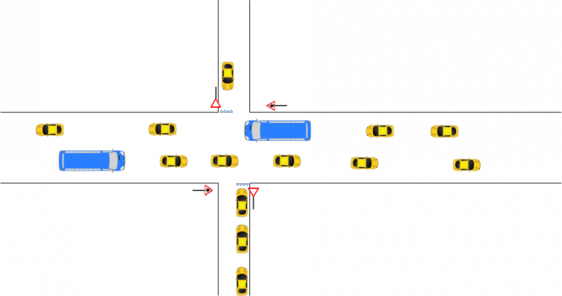 Schéma d’un carrefour en croix avec un axe prioritaire (YF-multimob, 2019)