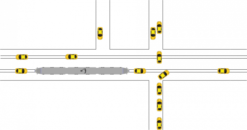 Schéma d’un carrefour en croix avec un axe tram non prioritaire (YF-multimob, 2020)